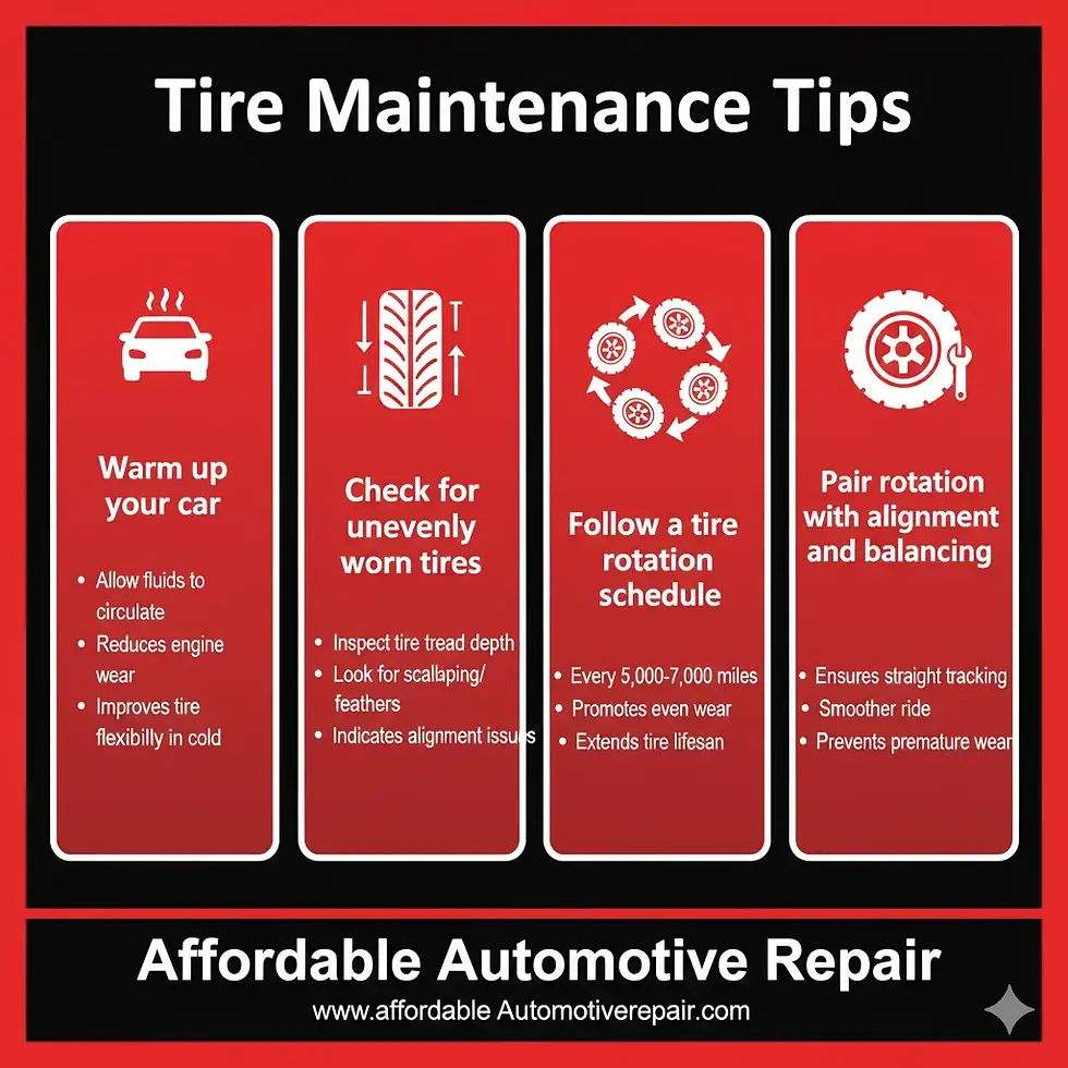 A trusted service like Affordable Automotive Repair can help schedule your tire rotation and check for uneven wear. Regular checks ensure your tires wear evenly, extending the lifespan of your tires and keeping you safe on the road.